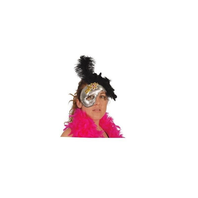 Antifaz media cara estilo veneciano, con plumas negra decorativa. Color metalizado con tonos dorados.