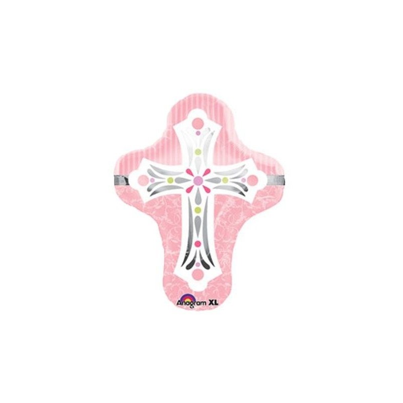 Globo comunion rosa en forma de cruz de 71x58cm ,se puede hinchar con helio.