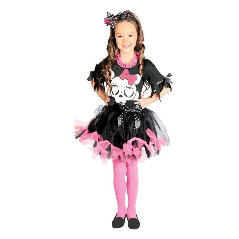 Disfraz calavera negro y rosa para niña talla 5-6 años, bonito disfraz de skull girl para niña en tu fiesta de halloween. Incluye diadema y vestido con tutu (no incluye medias)