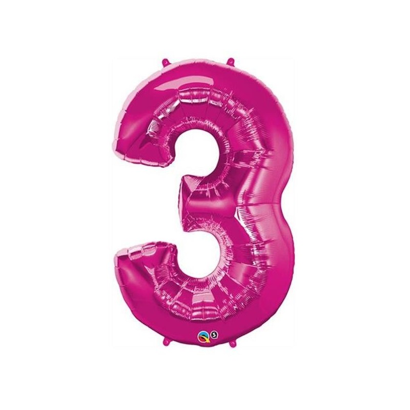 Globo numero 3 en color magenta de 86 cm de altura,se puede hinchar con helio. Consumo de Helio: 0,0450m3 (helio no incluido en el precio) Tiempo de Flotacion con Helio: 3-4 Días Aproximadamente Valvula de autocierre: si Todos nuestros globos se venden si