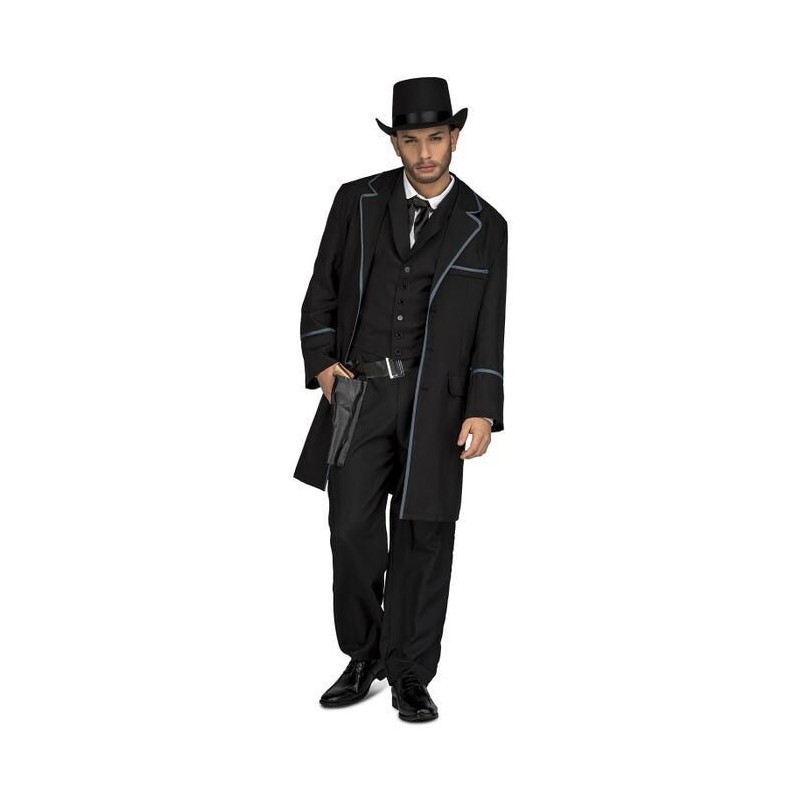 Disfraz de pistolero del oeste para hombre en talla L, Incluye abrigo, chaleco, pantalón, corbatín y cinturón con pistolera