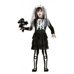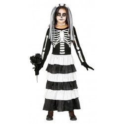 Incluye camisa, pantalon y falda. Tallas: 1-2, 3-4, 5-6, 7-9 y 10-12 años Disfraz de esqueleto infantil par aniña ideal para tu fiesta de terror o hallooween.