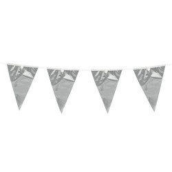 Guirnalda triangular plata metalico de 10 metros barata, esta guirnalda triangular en color plata metalico mide 10 metros de largo es ideal para decoraciones tematicas de color o bodas o comuniones. Tienda de banderines y banderas baratas online