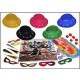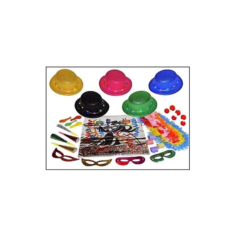 Incluye bolsa metalizada, bombin escarcha con luces led, serpentina 5 rollos, antifaz holografico metalizado,trompeta holografica metalizada, globo, collar fiesta y nariz de payaso.