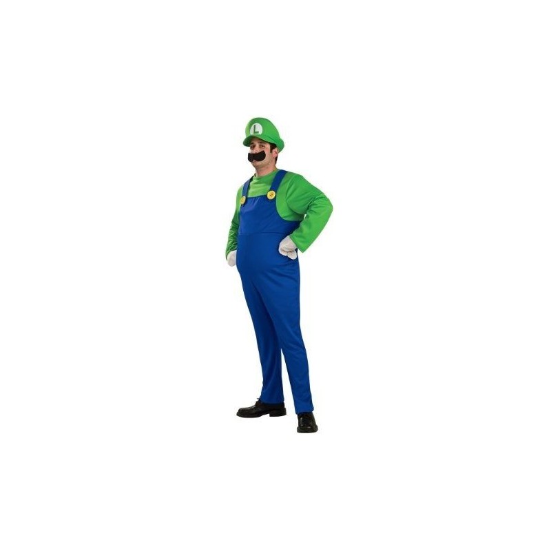 Disfraz de Luiggi para hombre en la talla M de adulto. El famoso hermano fontanero del videojuego Mario Bros. Traje con licencia oficial de Super mario. Incluye traje deluxe, barriga, bigote con pega, sombrero y guantes.