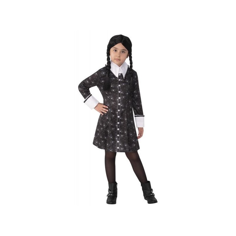 Disfraz de Miercoles Adams original de la serie de Netflix Wednesday. Incluye vestido manga larga impreso digitalmente con motivos de calaveras y esqueletos. Cuello alto y puños con adornos florales. Con cierre de velcro trasero. Traje de Miercoles infantil para niña, completa tu disfraz con la Mano "cosa". Peluca NO Incluida