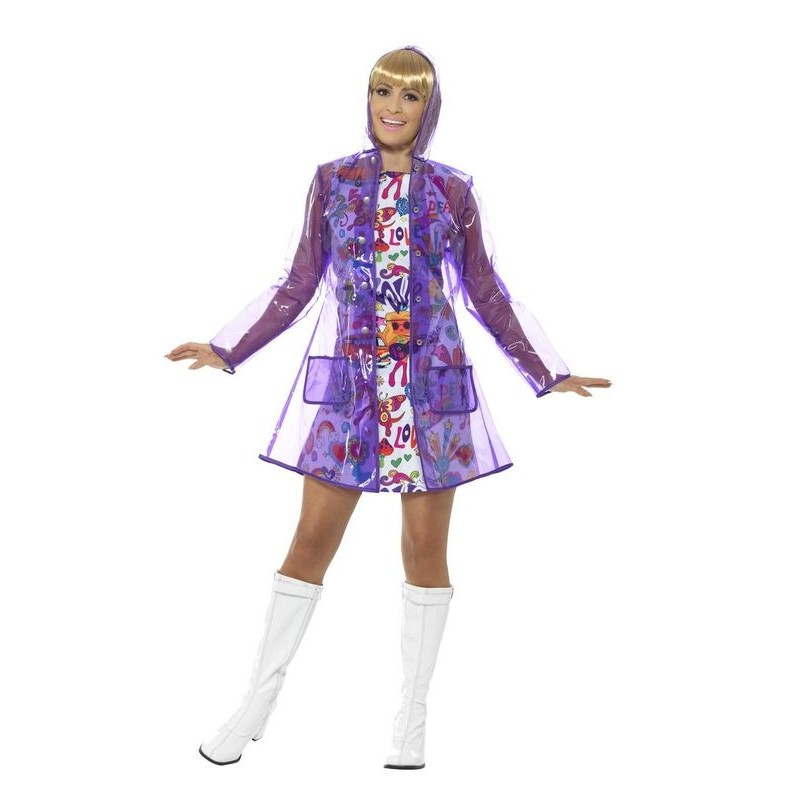 Chubasquero morado transparente años 60 hippie talla S-M, disfraces de años 60 o hippies baratos para adultos y niños.